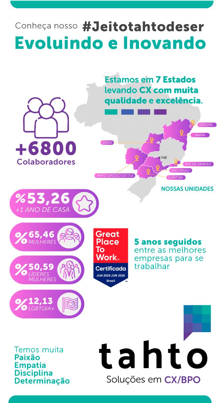 Somos a Tahto, uma empresa com uma nova mentalidade de negócios, que usa a tecnologia não apenas para criar soluções de atendimento ao cliente, mas para manter o ser humano no centro de tudo o que fazemos. Somos mais de 8 mil colaboradores espalhados em 5 estados do Brasil, pessoas de todas as diversidades, culturas, raças, gêneros, e que são valorizadas pela sua história.